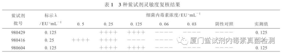2.1 鱟試劑靈敏度的復核 參照中國藥典1995年版操作,結果與標示靈敏度(λ)相符,結見表1。